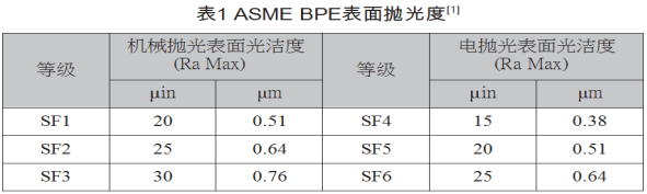 管道內壁應易于清洗,粗糙的管壁容易滋生微生物,風險較高。盡量采用機械焊接,并盡量減少焊口數量。ASME BPE中對管道內表面拋光度做出了要求。機械拋光表面光潔度分為三個等級,分別是SF1\SF2\SF3;電拋光表面光潔度分別為三個等級,分別為SF4\SF5\SF6。表1為ASME BPE中對管道內表面拋光度的要求。