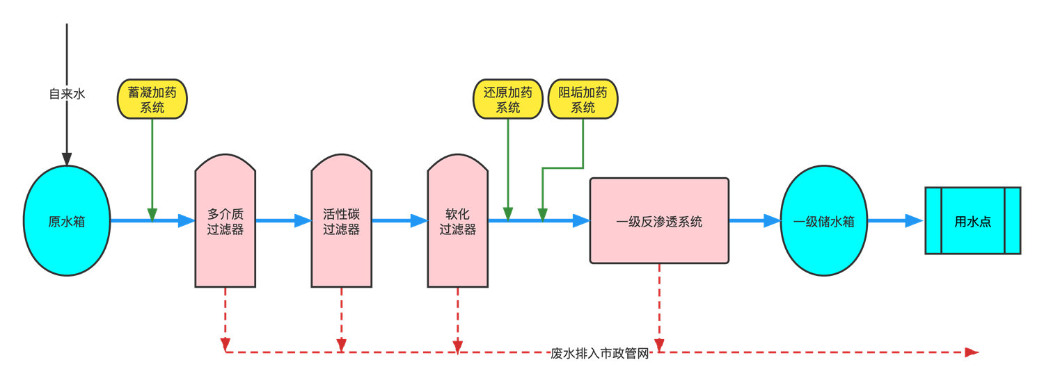 雙級反滲透一般由多介質過濾裝置,活性碳過濾裝置,精密過濾雙級RO膜組裝置組成,主要目的是去除原水中含有的泥沙、鐵銹、膠體物質、懸浮物,色素、異味、生化有機物,降低水的余氨值及農藥污染等有害的物質。如果原水中鈣鎂離子含量較高時,還需增加軟水裝置,主要目的在于保護后級的反滲透膜不受大顆粒物質的破壞,從而延長反透膜的使用壽命,減少企業設備維護成本。
